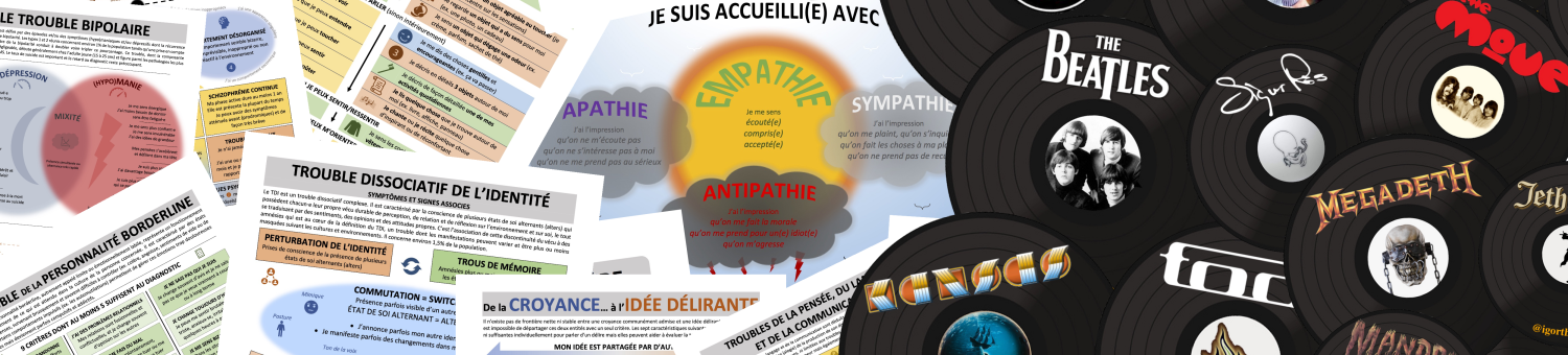 Outre le format classique du billet de blog, je propose également des fiches destinées à un large public et que je classe de façon assez arbitraire dans 6 catégories : Informer & Comprendre, Ressentir, Penser & Agir, Soigner & Contraindre et Prescrire.