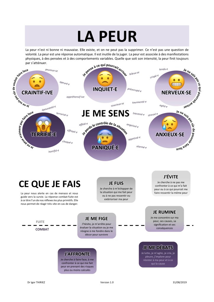 La peur n’est ni bonne ni mauvaise. Elle existe, et on ne peut pas la supprimer. Ce n’est pas une question de volonté. La peur est une réponse automatique. Il est inutile de la juger. La peur est associée à des manifestations physiques, à des pensées et à des comportements variables. Quelle que soit son intensité, la peur finit toujours par s’atténuer.