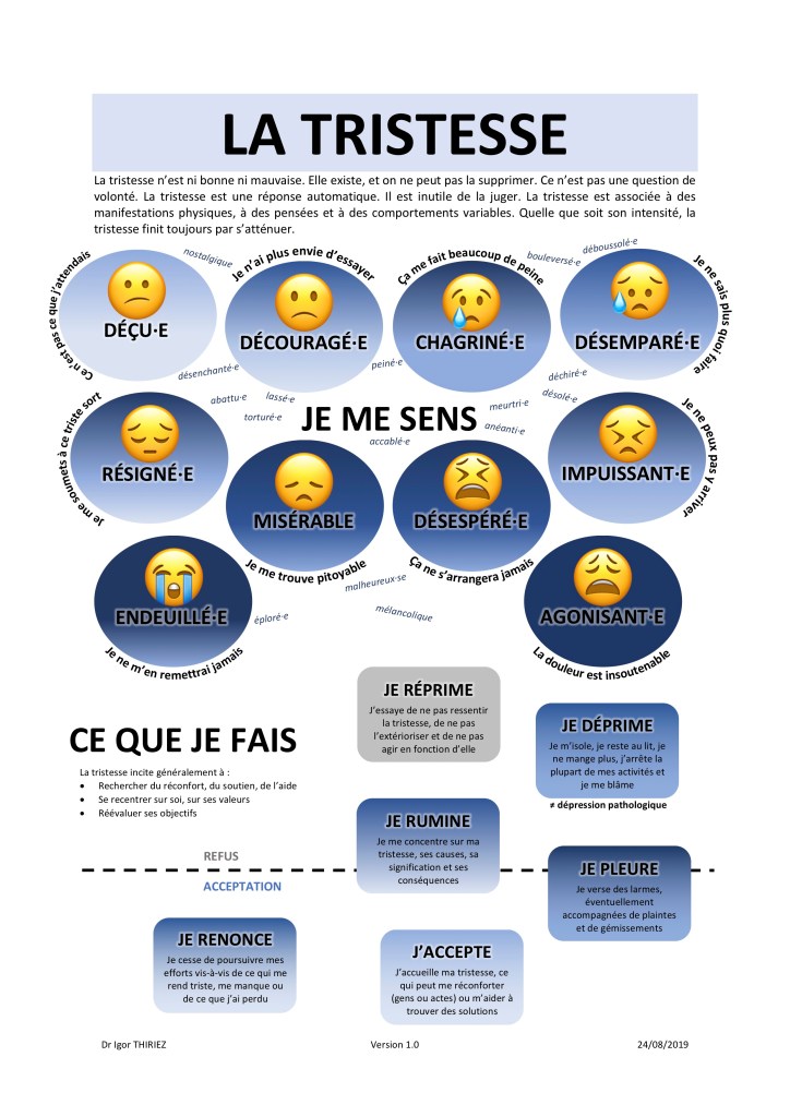 La tristesse n’est ni bonne ni mauvaise. Elle existe, et on ne peut pas la supprimer. Ce n’est pas une question de volonté. La tristesse est une réponse automatique. Il est inutile de la juger. La tristesse est associée à des manifestations physiques, à des pensées et à des comportements variables. Quelle que soit son intensité, la tristesse finit toujours par s’atténuer.