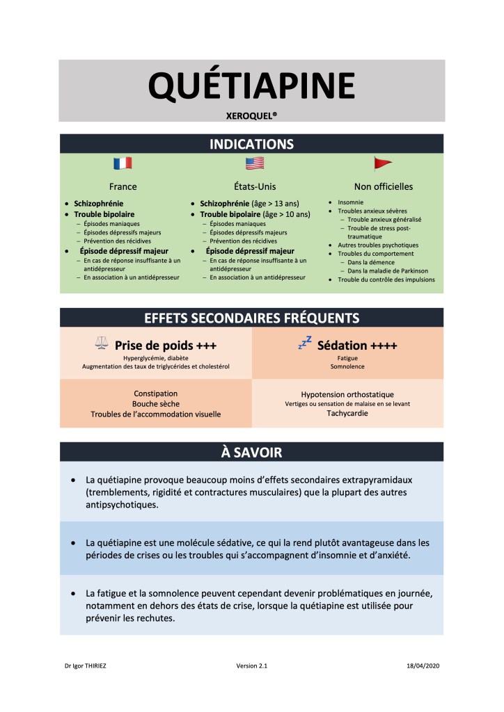 Cette fiche rassemble des informations importantes au sujet d’un médicament : les indications officielles en France et aux États-Unis ainsi que des indications non officielles, des effets secondaires fréquemment rencontrés et enfin quelques remarques supplémentaires. Ce document n’est pas pour autant exhaustif.