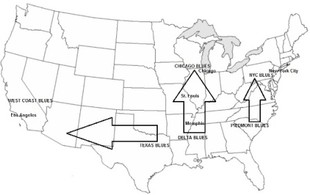 Les premières vedettes du blues sont pourtant des femmes qui débutent au sein de troupes itinérantes (minstrel et medecine shows) avant de migrer vers New York pour se produire dans les théâtres vaudeville et interpréter les premiers standards écrits par des compositeurs noirs. Ce nouveau genre musical axé sur la souffrance plutôt que la joie est toutefois adapté au public blanc, les chanteuses Ma Rainey, Ida Cox ou encore Bessie Smith évoluant sur douze mesures, soutenues par un orchestre, ceci ne laissant que rarement la place aux écarts et improvisations. Ce blues très empreint de jazz évolue alors progressivement vers une musique plus dansante et attrayante. Le tempo augmente, les grands orchestres de swing se muent en des formations plus compactes et mettent l’accent sur des contrepoints plus directs et accrocheurs. Le jump blues newyorkais incarné par Louis Jordan se caractérise alors par la persistance du message originel si ce n’est que la souffrance du peuple noir est désormais chantée avec davantage de détachement, voire d’ironie. La migration des bluesmen texans vers la Californie est à l’origine d’une fusion plus délicate avec le jazz qui accorde une importance croissante aux performances des guitaristes solistes. T-Bone Walker, pionnier en matière d’amplification de l’instrument, et Johnny Otis incorporent ainsi de doux phrasés issus du jazz au sein d’un jump blues particulièrement sophistiqué. Parallèlement, la migration noire du delta vers Chicago donne naissance à la version la plus turbulente du blues urbain. La férocité du jeu très archaïque des instrumentistes est décuplée par l’amplification de la guitare électrique, nécessaire afin de toucher le plus large public des clubs. Des prestations orageuses de Muddy Waters aux élucubrations primitives de Johnny Lee Hooker, en passant par le roi du slide Elmore James ou par les shouters Howlin’ Wolf et Big Joe Turner, ce terreau d’artistes demeure le plus fertile des États-Unis aux environs de la seconde guerre mondiale.